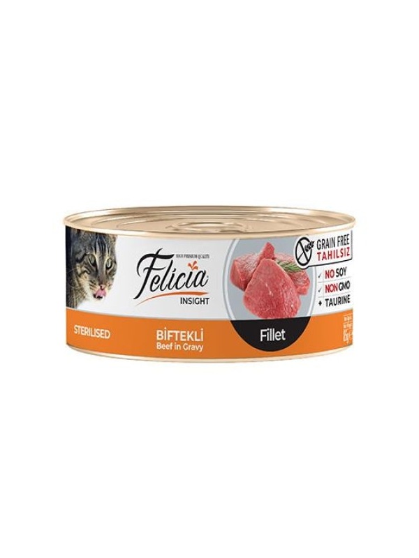 Felicia Tahılsız Kısırlaştırılmış Biftekli Fileto Kedi Konservesi Felicia Tahılsız Kısırlaştırılmış Biftekli Fileto Kedi Konservesi, yetişkin kedilere özel olarak üretilen konserve kedi mamalarından biridir. İçeriğindeki özel protein kaynakları ile yetişkin kedinizin sağlıklı ve dengeli beslenmesine yardımcı olmaktadır. Felicia konserve ürünleri doğal ve katkısızdır, yapay renklendirici ve aroma içermez, sağlıklı kedi beslenmesi için yapılan son bil...Devamı[...]